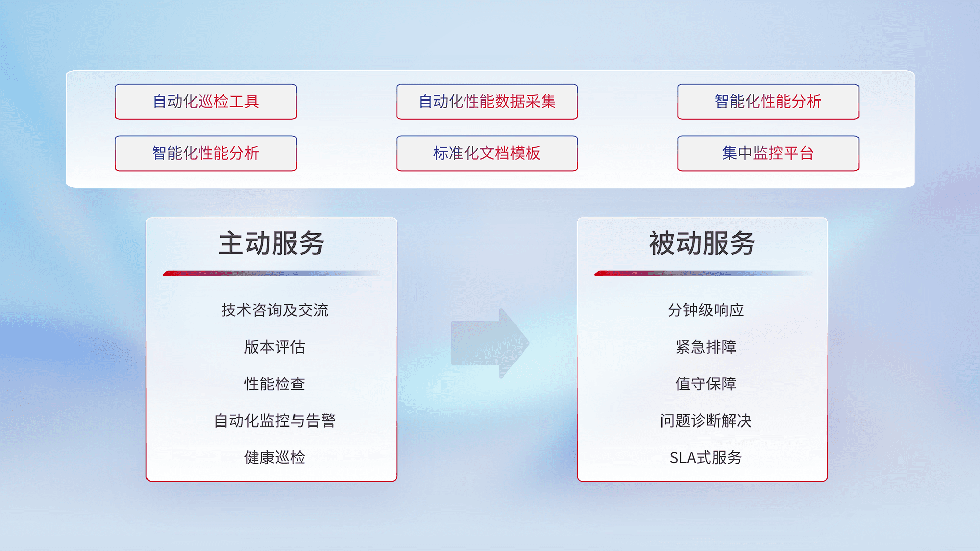 智能化工具和标准化文档,,,保障服务质量,,,,提供主动服务(包含技术咨询、、、版本评估、、性能检查、、、、自动化监控与告警、、、健康巡检)和被动服务包含(分钟级响应、、紧急排障、、、值守保障、、、、问题诊断解决、、、、SLA服务)。。。